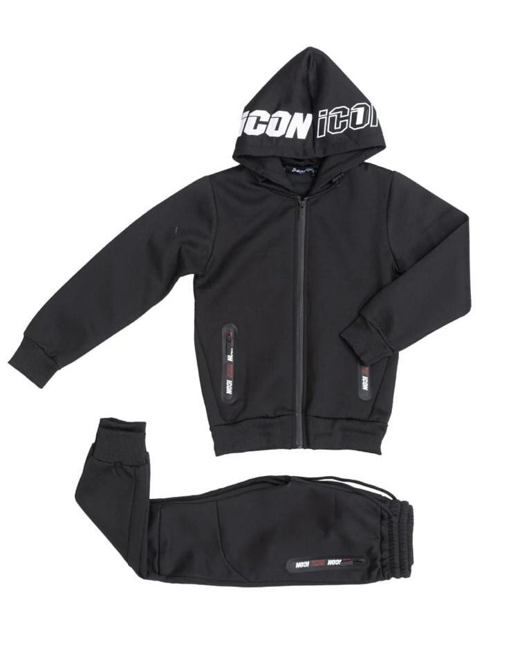 Dit zwarte ICON joggingpak is dé perfecte combinatie van stijl en comfort voor actieve kinderen. De set bestaat uit een zachte hoodie met capuchon en een bijpassende joggingbroek, beide voorzien van het iconische ICON-logo voor een herkenbare, stoere look.