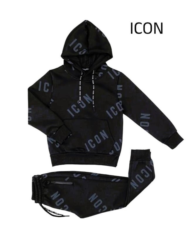 Dit zwarte "ICON" joggingpak met all-over print is perfect voor kinderen die houden van een opvallende, sportieve stijl. De set bestaat uit een comfortabele hoodie met capuchon en een bijpassende joggingbroek, beide bedrukt met het iconische "ICON" logo in een all-over design.